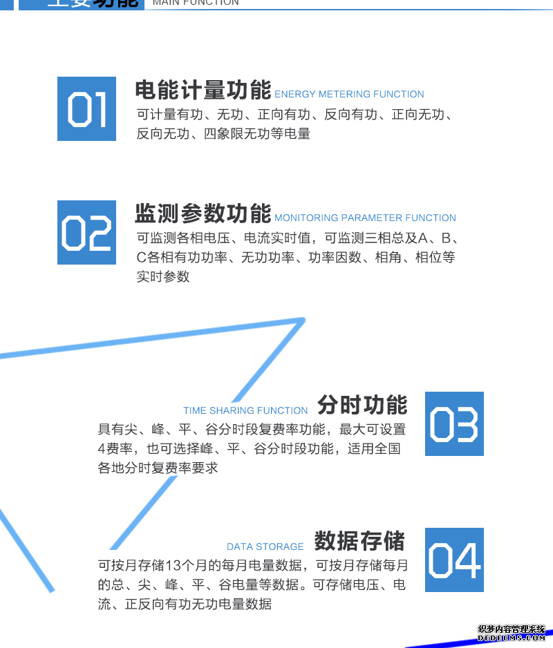 - 主要功能:有功,功率因素,有功功率,無功功能,四象限無功,電壓,電流,事件報警,費控